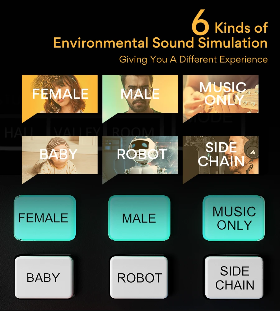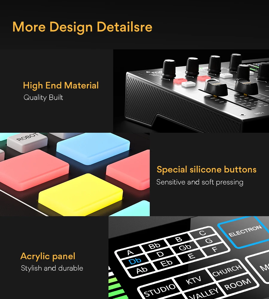 Utrustad med 6 reverb-lägen, auto-tune och 4 pitch changers för professionell ljudkontroll.